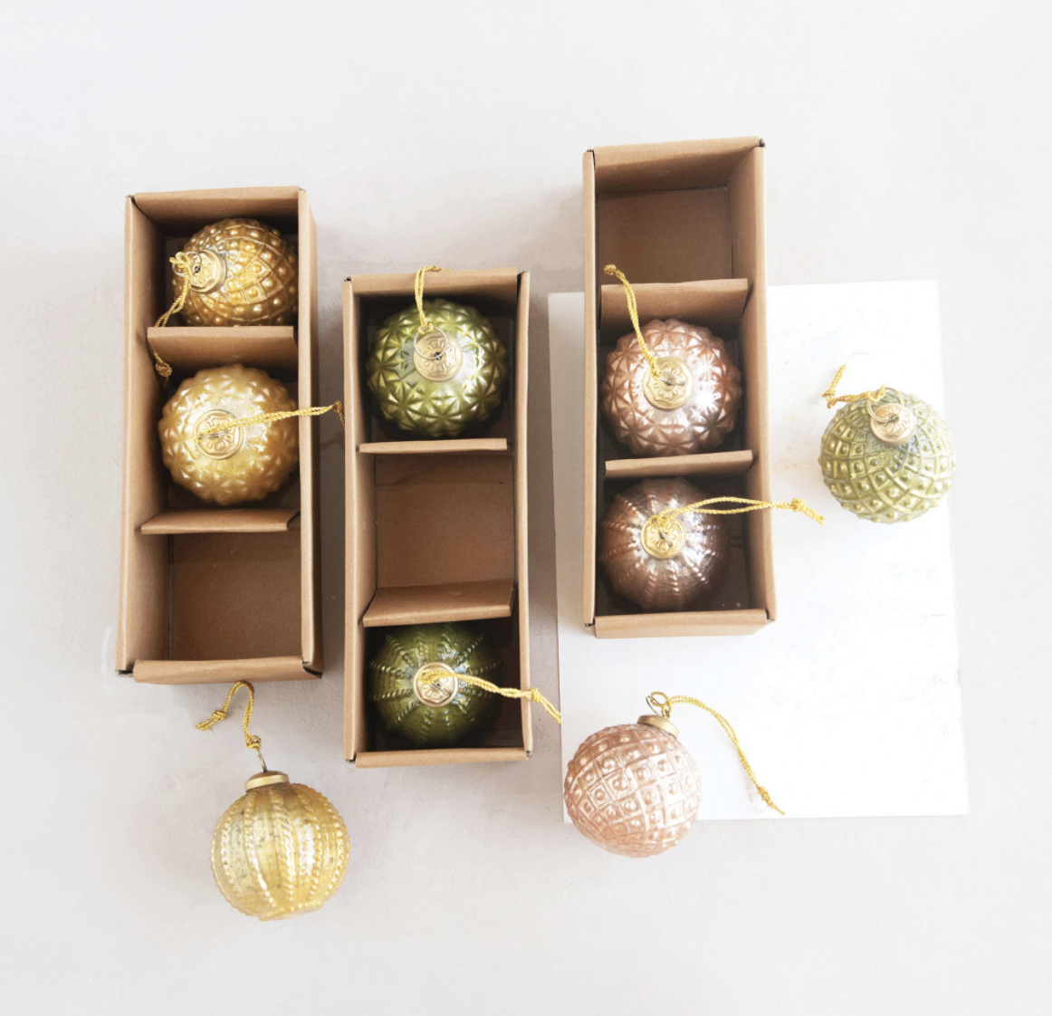 ROUND EMBOSSED GLASS ORNAMENTS IN KRAFT BOX, SET OF 3, 3"