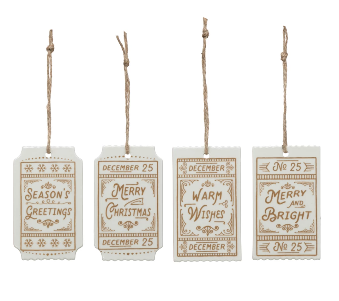 These ornaments look great on any style Christmas tree. Made out of stoneware, these debossed Christmas tag ornaments come in 4 styles and each feature a festive saying. These add style to any Christmas tree, and make decorating with friends and family fun.