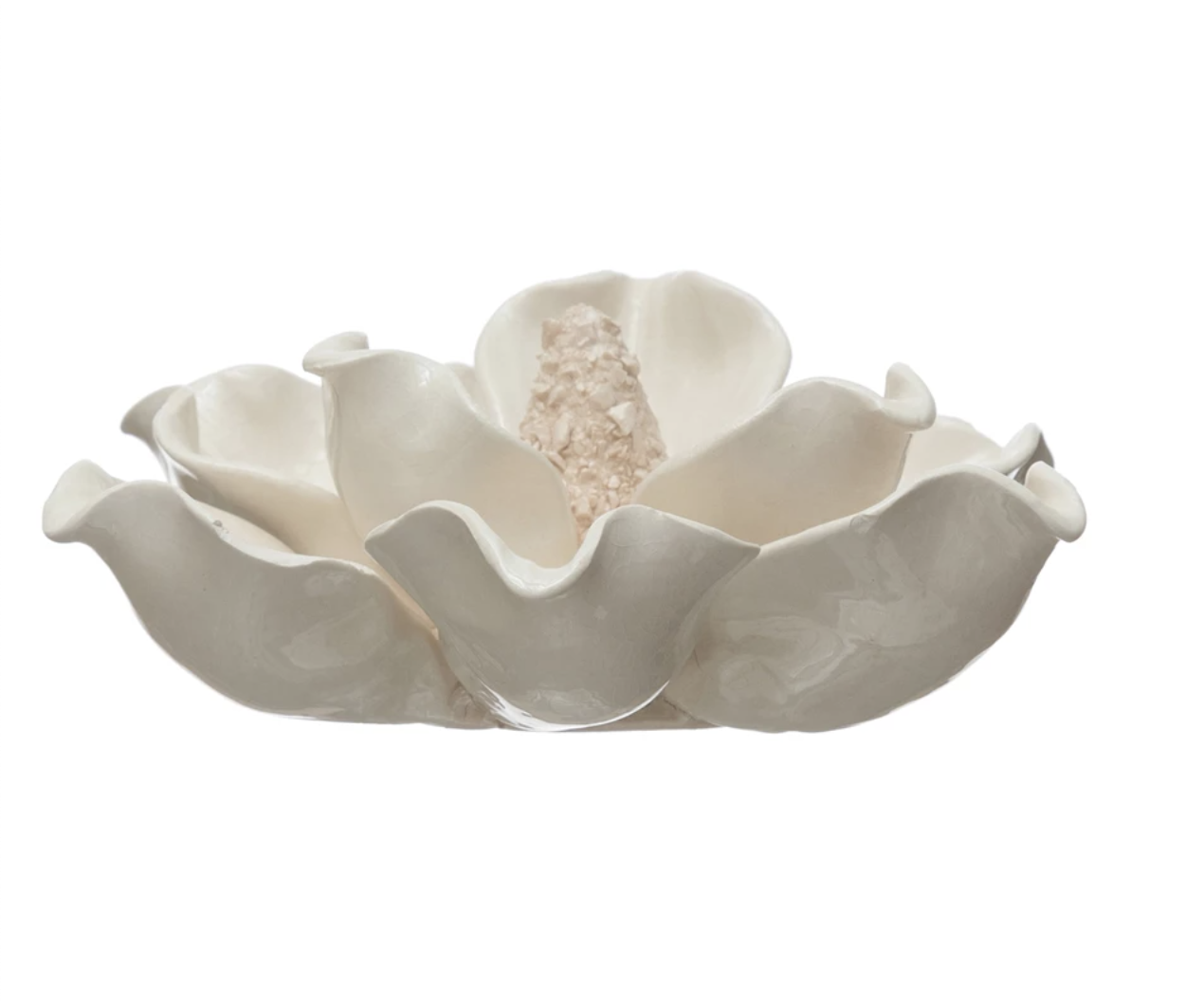 This decorative piece is a unique and beautiful way to decorate for the holidays. Made out of stoneware, this handmade flower decoration can be placed on any open shelves or tabletops. With a simple white finish, this magnolia adds a nature-inspired element to any festive home.