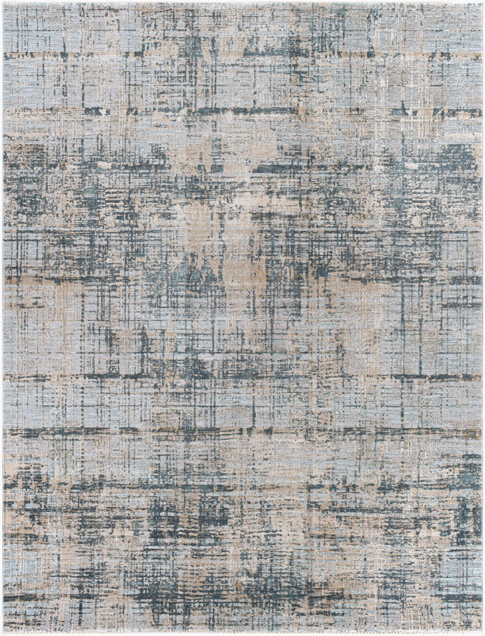 This machine-woven area rug, crafted from synthetic fibers, showcases a contemporary abstract pattern with a high/low pile that adds texture and dimension. The color scheme primarily features navy, taupe, and light gray, creating a sophisticated and modern look that effortlessly complements a variety of decor styles.
