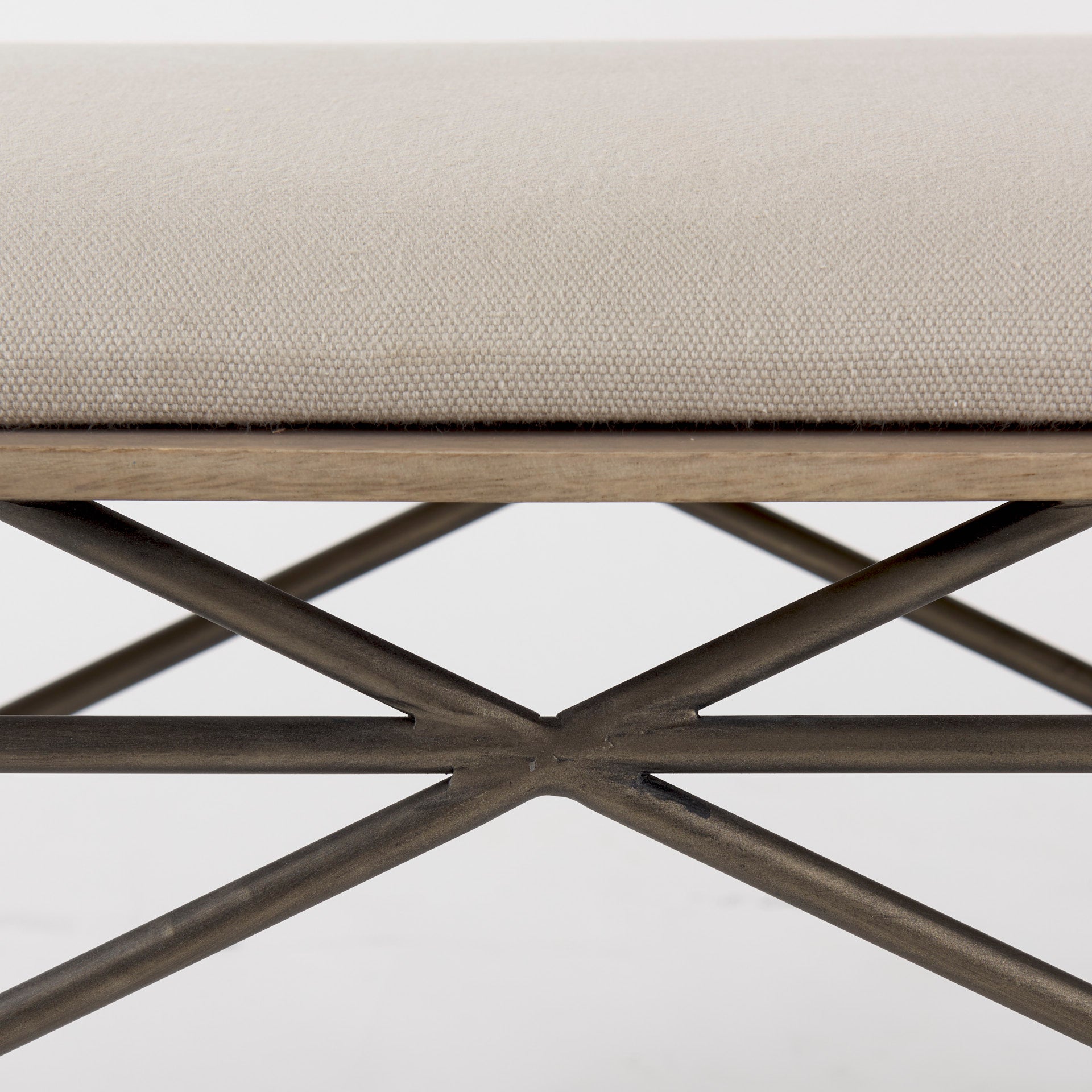 Camille is a cream color bench featuring plush fabric and sturdy metal framing.