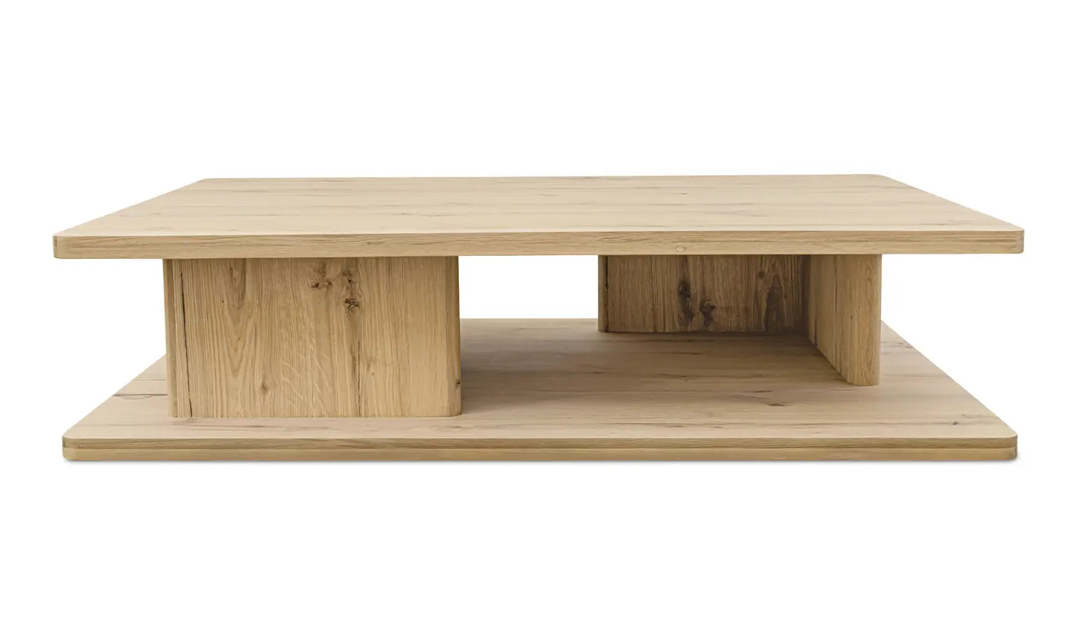 The Casey coffee table harmoniously blends rustic charm with contemporary aesthetics. A distinctive vertical support adorned with a refined bullnose edge adds sculptural grace to its minimalist design. Ample open storage beneath the tabletop offers practical display or storage solutions.