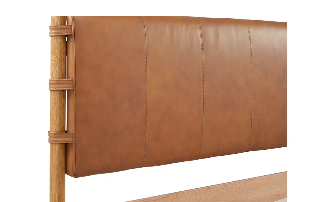 Crafted with a high-quality leather headboard and rounded solid oak legs, the Colby Queen bed frame elegantly brings understated luxury with superb craftsmanship. The soft curves of the leather headboard provide a sense of warmth and coziness, while the rounded legs add a touch of organic form to the overall design. The clean lines and natural materials create a harmonious and sophisticated piece, fitting seamlessly into any contemporary space.