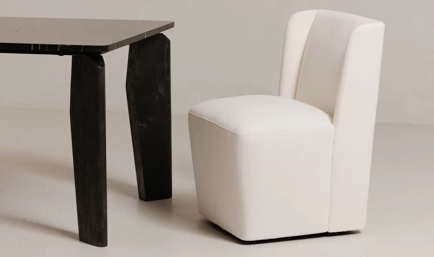 The Cormac rolling dining chair is all about comfort with a generously padded seat and backrest, a slight curve of the back and caster wheels that effortlessly glide across the floor. Crafted from high-performance fabric that is soft to the touch yet resilient against stains, spills, and daily wear.