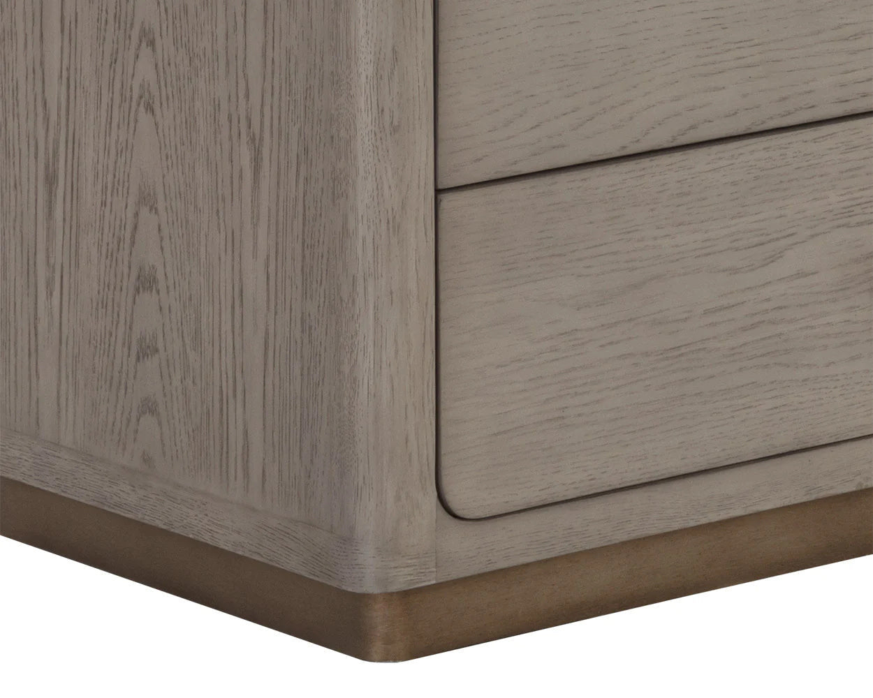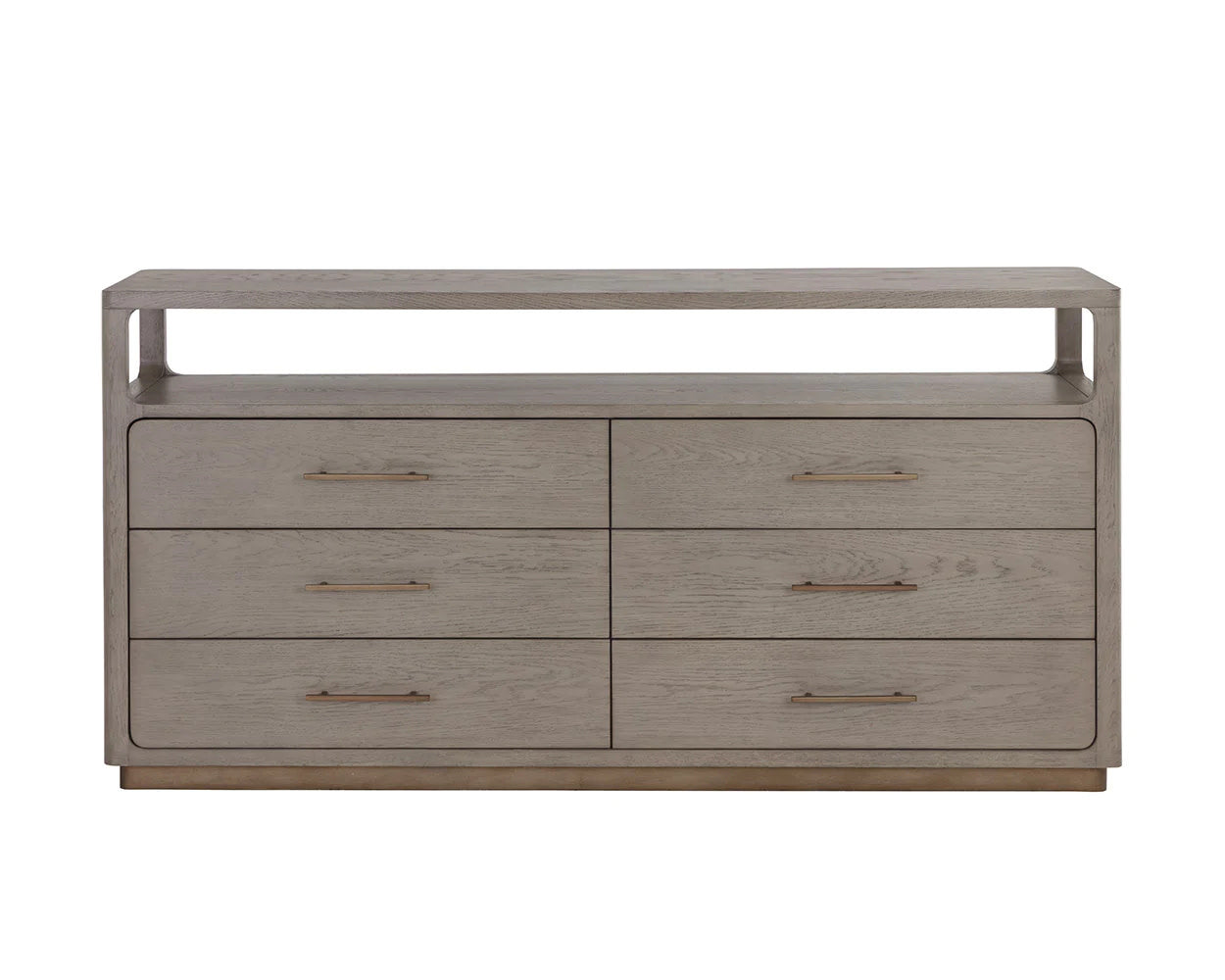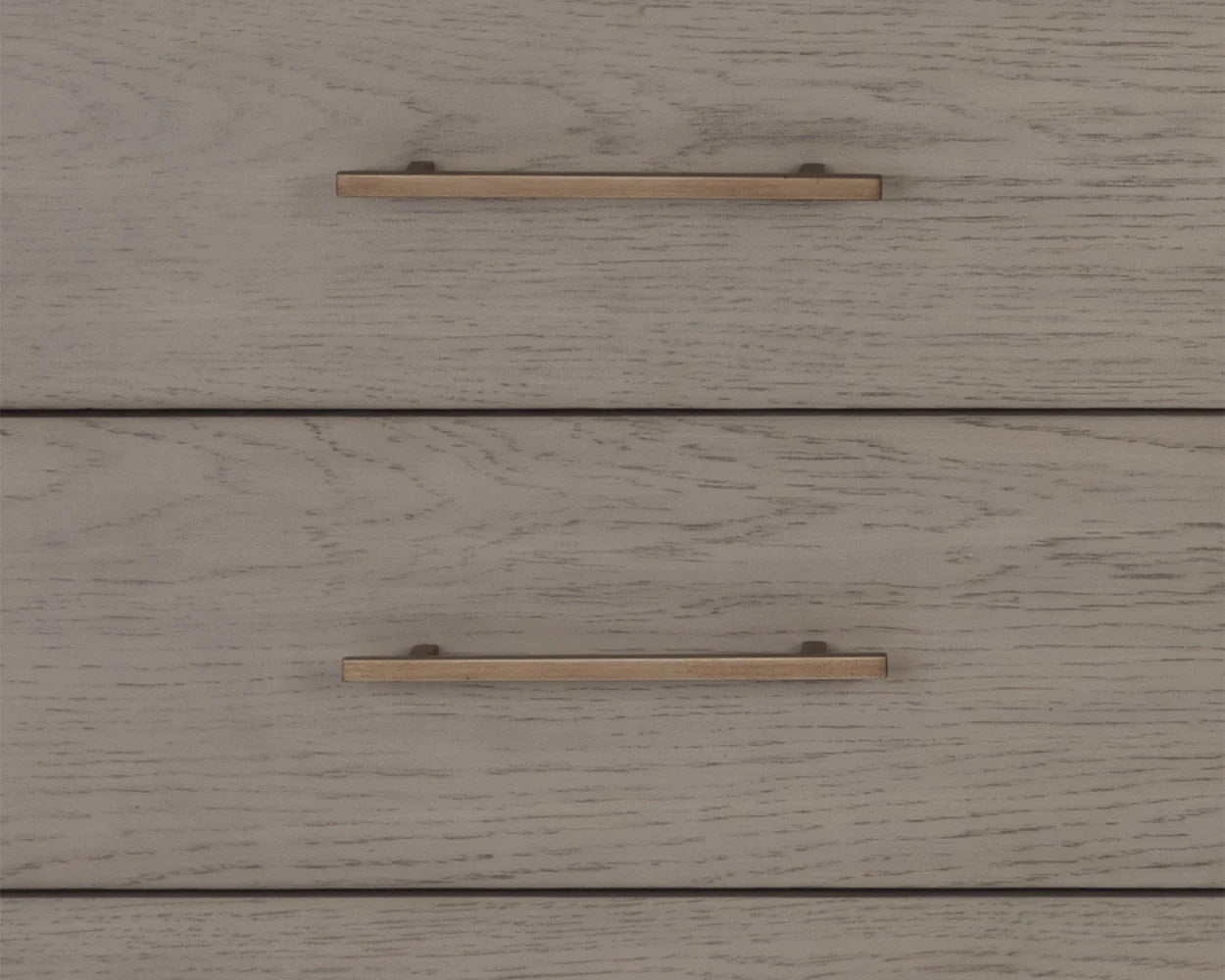 Clean lines lend the Danette Dresser its minimalist silhouette. Crafted with grey oak veneer that draws attention to the warm brass hardware. An open top shelf provides extra space for added decor. As wood is an organic, porous material, these pieces will contain natural variation of texture and may also exhibit fine indentations and cracks. Wood pieces will also display a disparity of colour and grain, and visible knots and burls that add to the character of each piece.