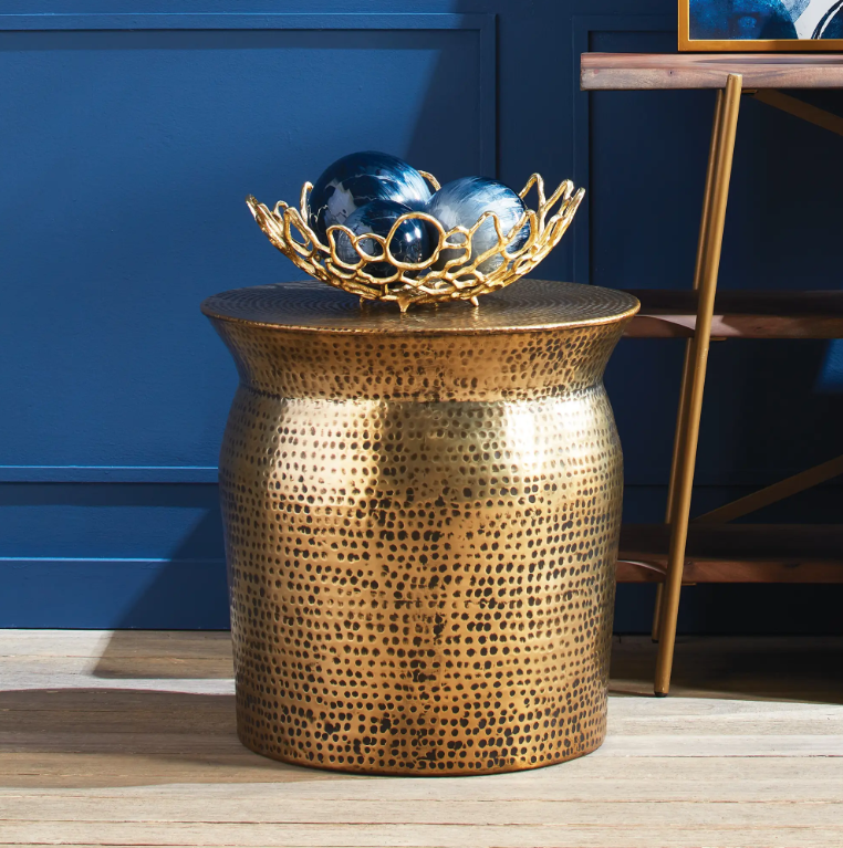 Generously scaled with a unique shape and hammered metal texture, the Dante Hourglass Accent Table is a handsome anchor piece for living room, den or study. 20 x 20 x 20.25. Interior use only. Clean with damp cloth. Dry immediately. Avoid harsh chemicals.