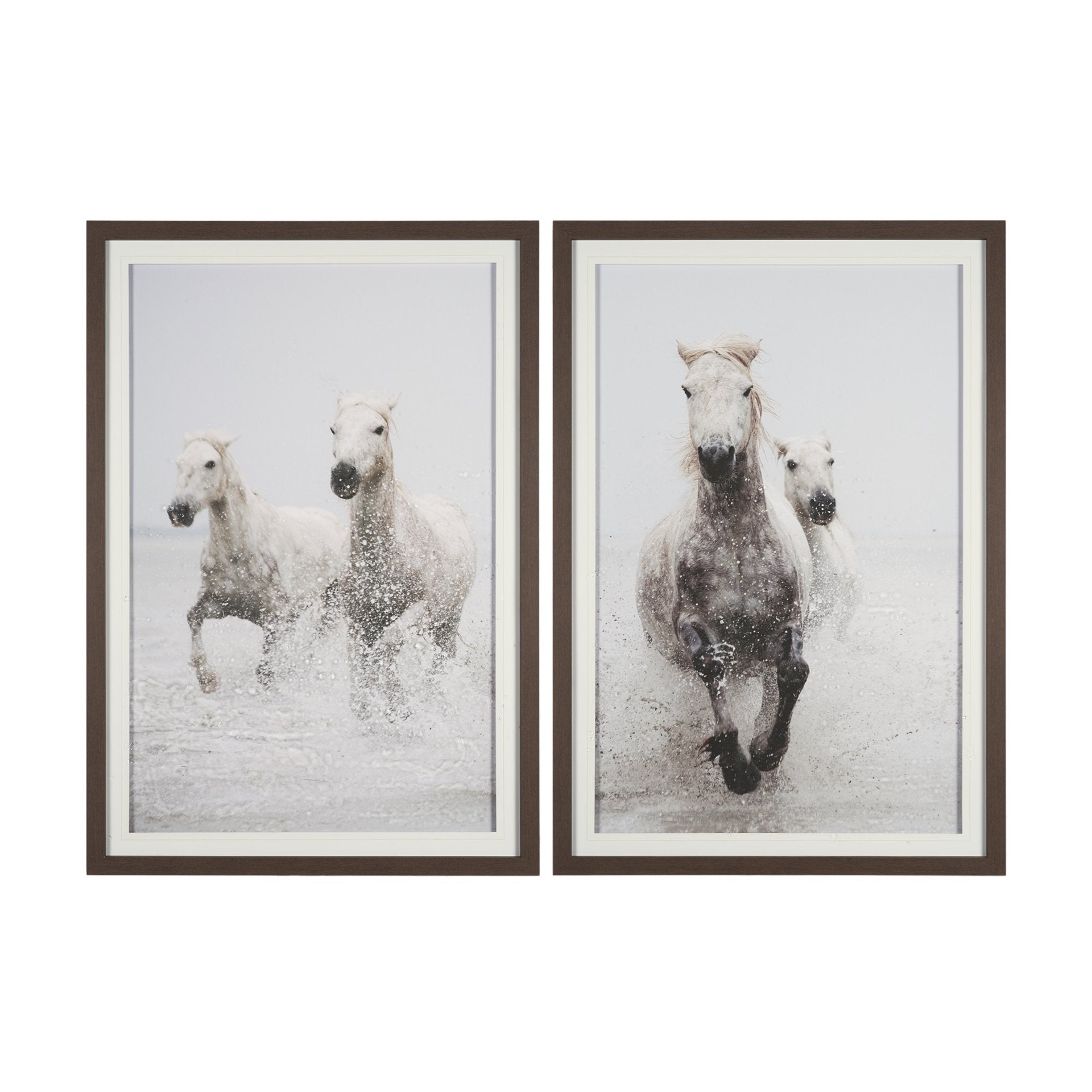"Determination Horse (Set of 2)" by Irene Sucocki is a breathtaking diptych capturing the raw power and grace of horses galloping through a sunlit shoreline. The interplay of monochrome hues highlights the dynamic splashes of water, while hand embellishments add dimension and life to the scene. Each piece is expertly framed, offering an elevated testament to the unbridled spirit of freedom and nature's beauty.