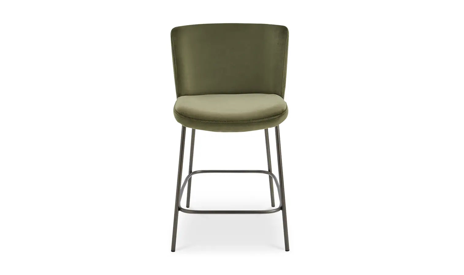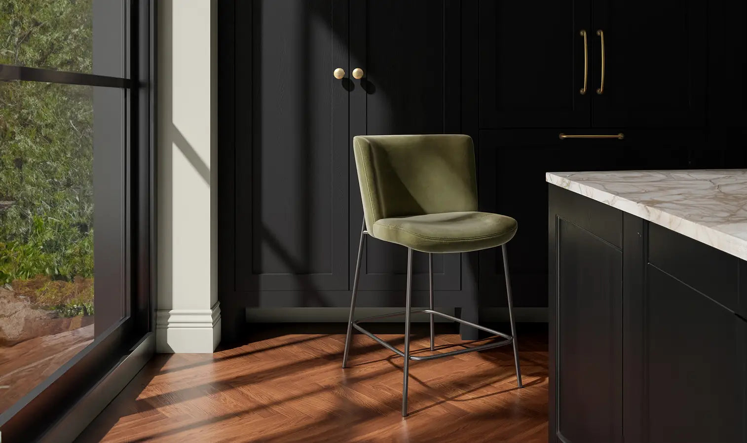 The Early counter stool is an elegant fusion of minimalist design and comfort that features a slim metal frame in a blackened bronze finish. Its seat and comfortably curved back are upholstered in soft fabric. It complements any dining setting, especially alongside wooden tables, presenting a clean, cohesive look that invites sophisticated ease.