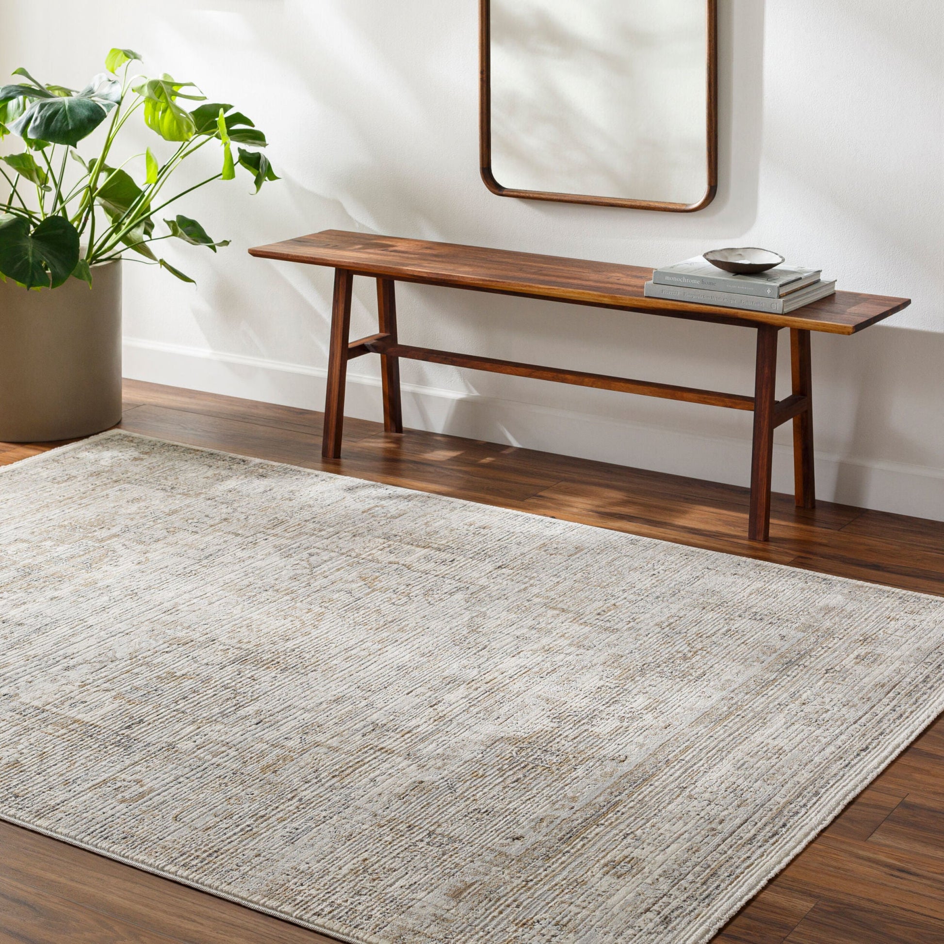 This synthetic rug features a medium pile that adds soft coziness to your space, complemented by a short fringe detail. Its traditional design, presented in modern neutral tones of cream, light grey, tan, and black, offers a timeless blend of classic and contemporary style, making it suitable for a variety of spaces.