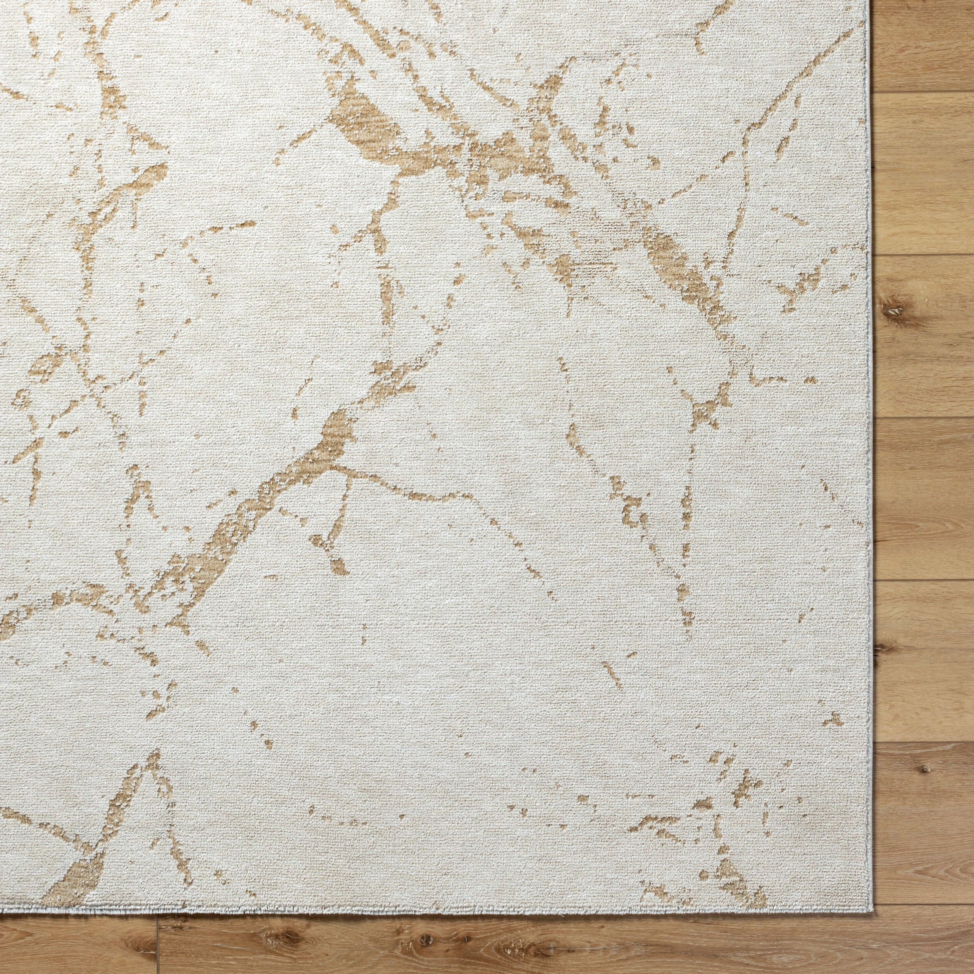 This synthetic area rug boasts a contemporary design inspired by the veining of natural stone, featuring a light creamy color with warm gold tones. Its medium pile provides a soft texture, adding both visual interest and comfort to any room.