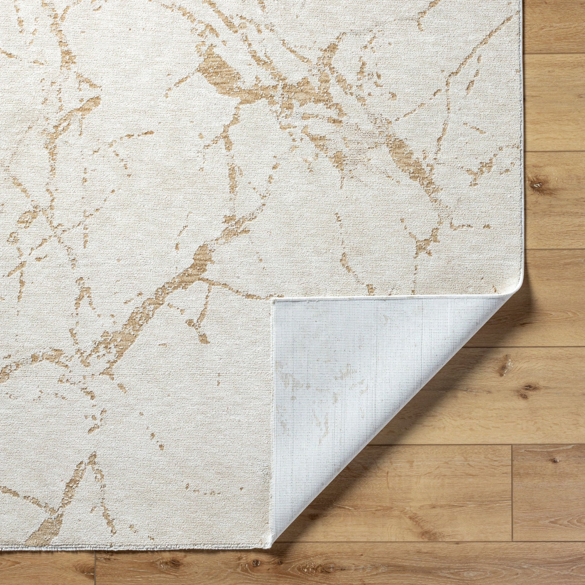 This synthetic area rug boasts a contemporary design inspired by the veining of natural stone, featuring a light creamy color with warm gold tones. Its medium pile provides a soft texture, adding both visual interest and comfort to any room.