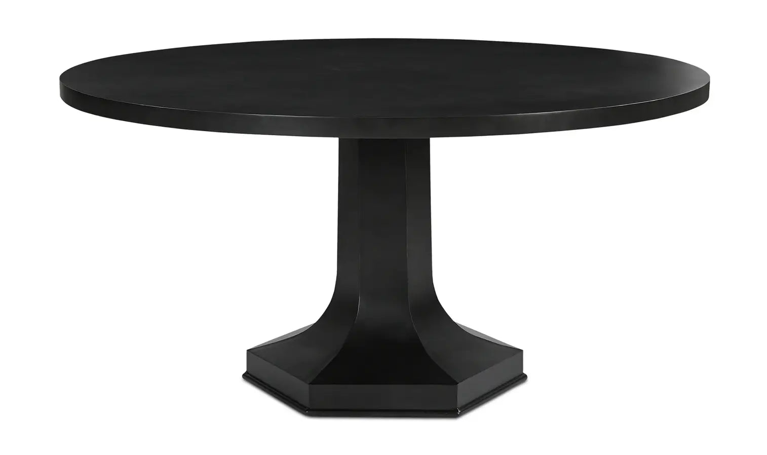 The Ethan dining table blends geometric precision with fluid grace. Its substantial tabletop rests upon a hexagonal base with gently curving sides, creating a continuous silhouette that marries strength and elegance. Crafted entirely from cast iron with a rich black finish, this sophisticated focal point whispers graceful appeal.