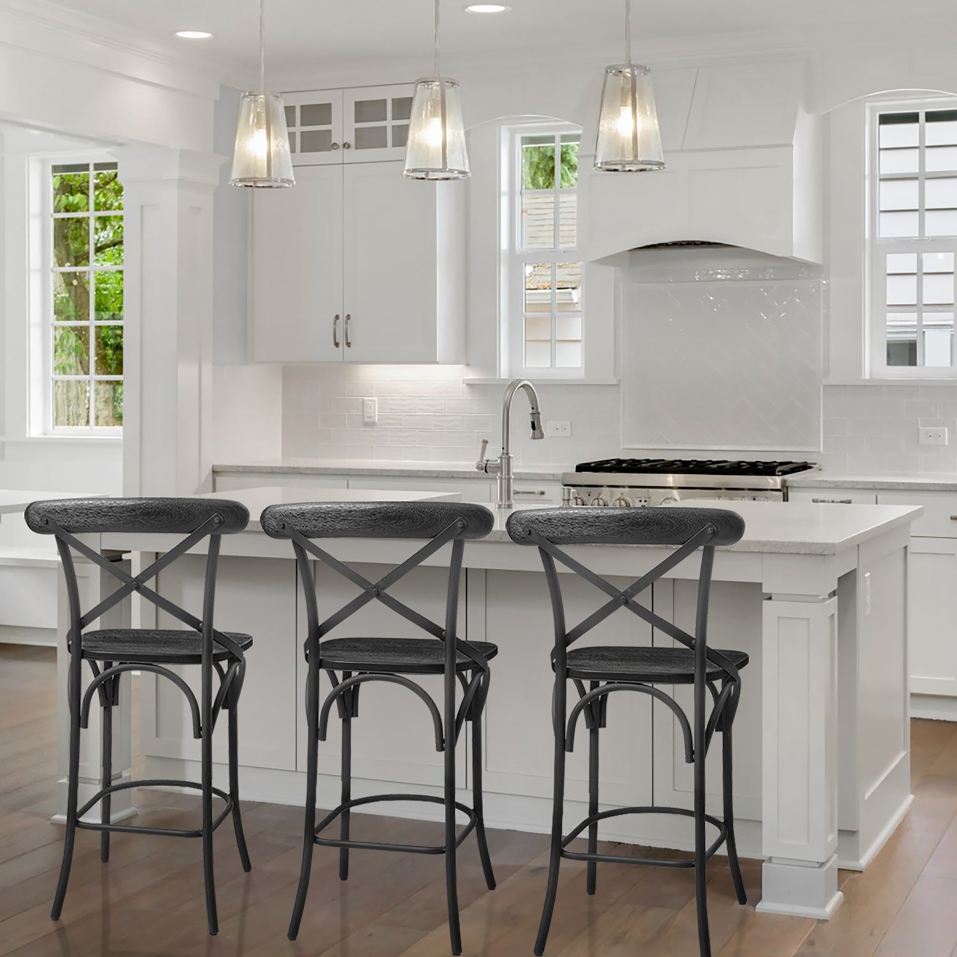 Thoughtfully designed to suit spaces based on the farmhouse design style, the Etienne III counter-height chair flaunts a sleek, country-inspired cross back design that is complemented by the juxtaposition of dark wood and metal components.