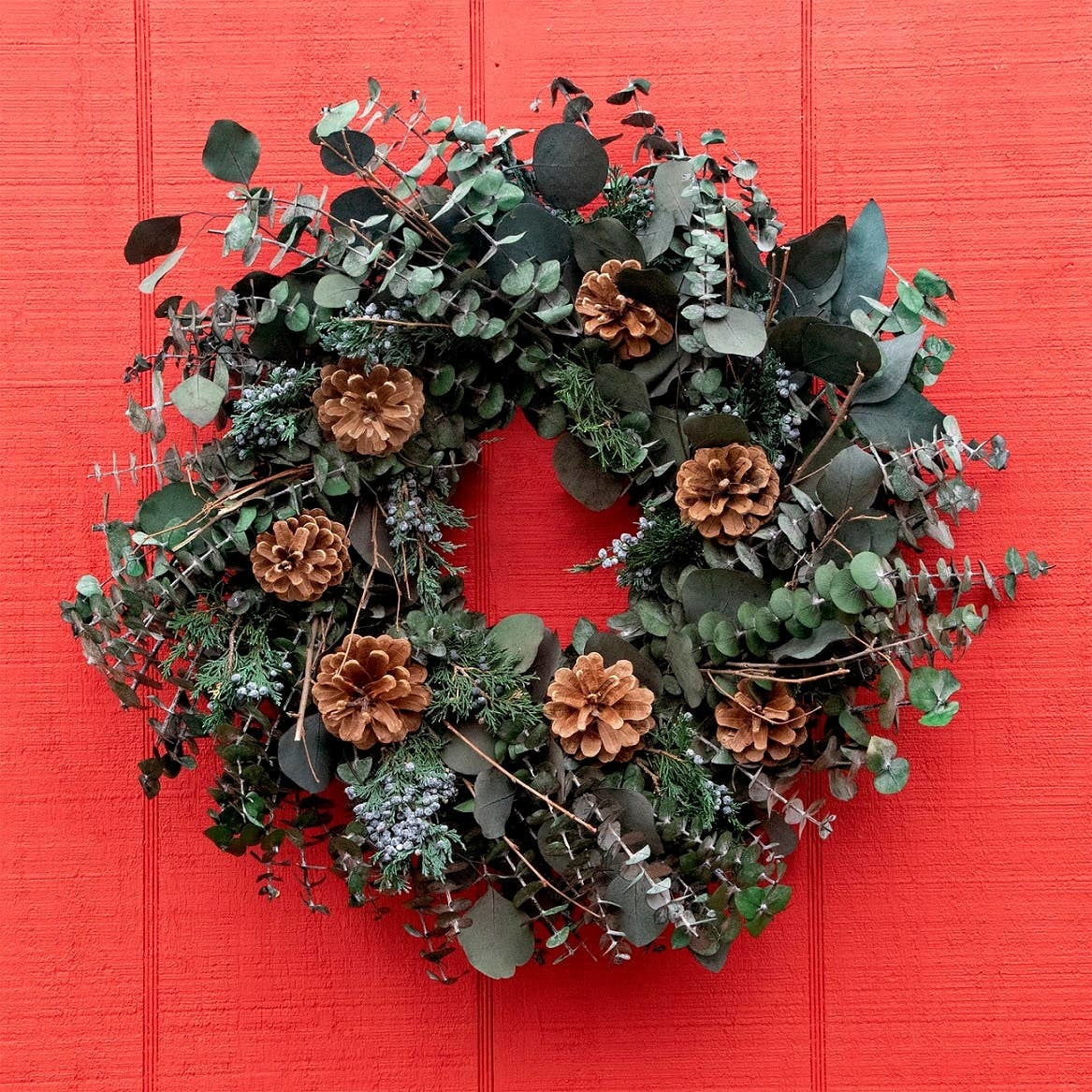 Handcrafted for the holiday season using a base of preserved baby & silver dollar eucalyptus, juniper and large pinecones to finish the naturally chic holiday look.