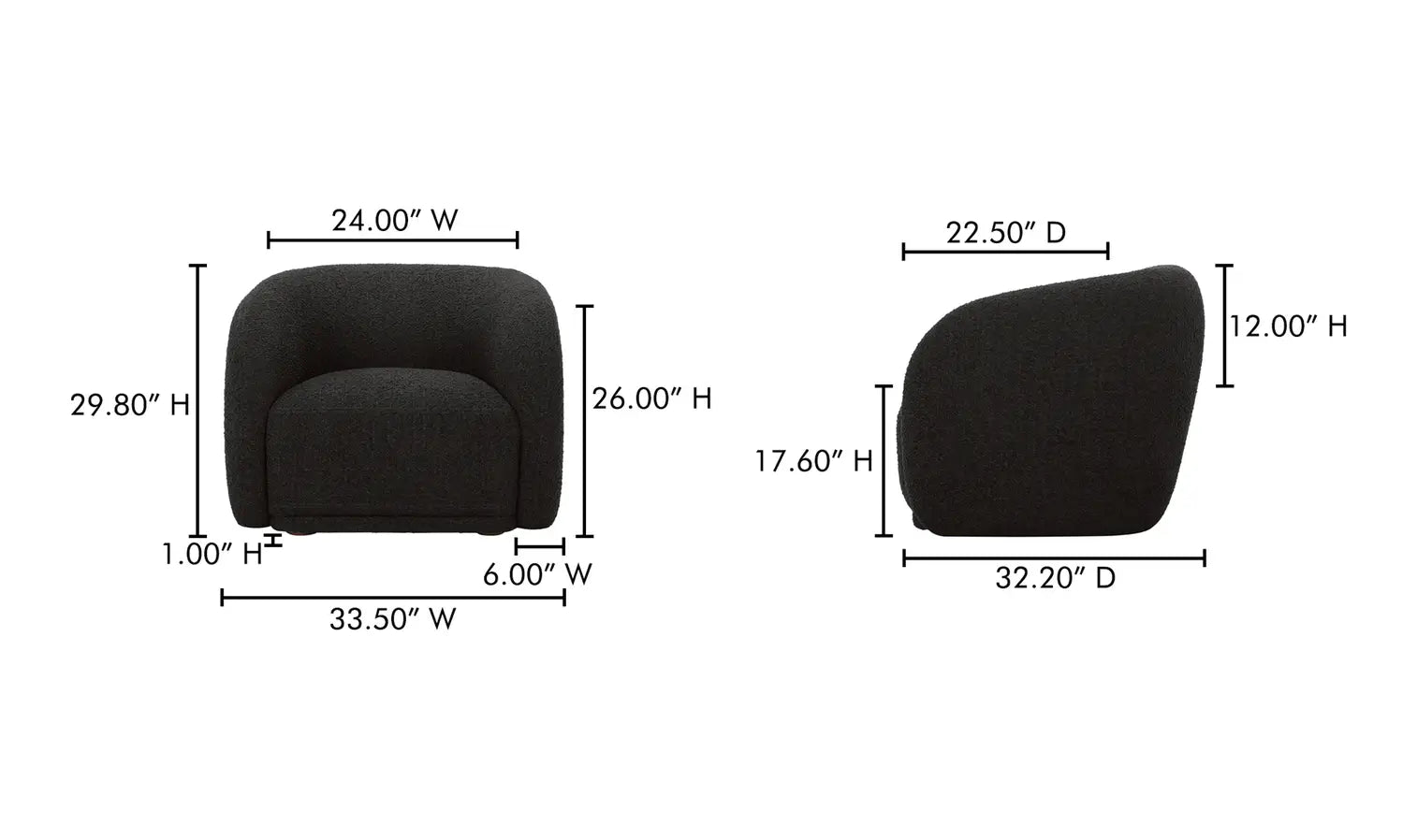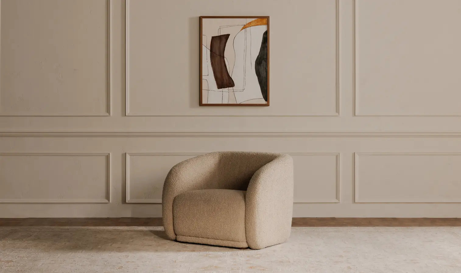 The exaggerated boucle fabric with a robust 100,000 rub count brings depth and an art deco feel to its contemporary form--a touch of elegance to expansive living.
