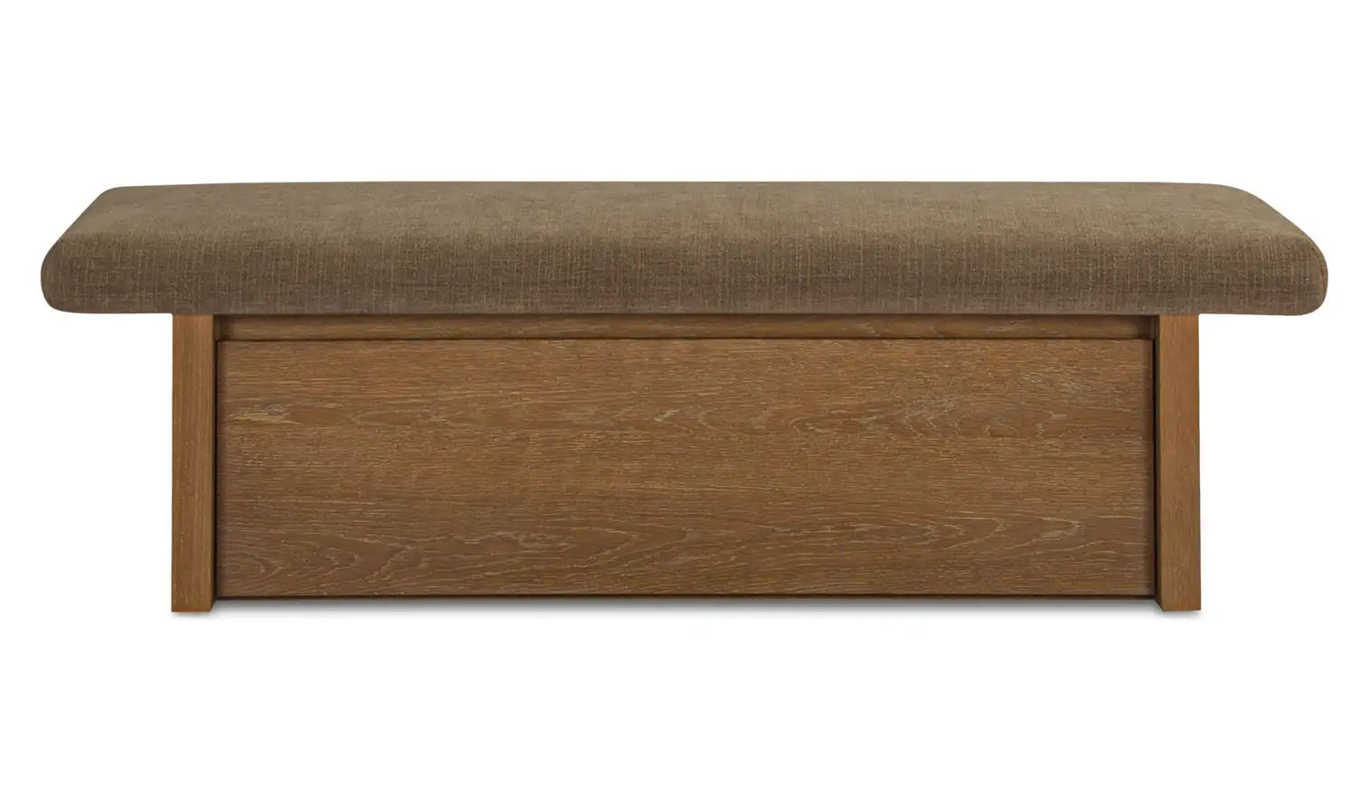 The Gemma storage bench marries contemporary elegance with versatile, functional design. Its generous, deep-seated top is wrapped in a soft, muted chenille, that effortlessly transitions the bench from entryway statement to sophisticated coffee table or seating at the foot of a bed. The recessed wooden base invites functional repose as a sleek wire-brushed drawer offers ample storage.