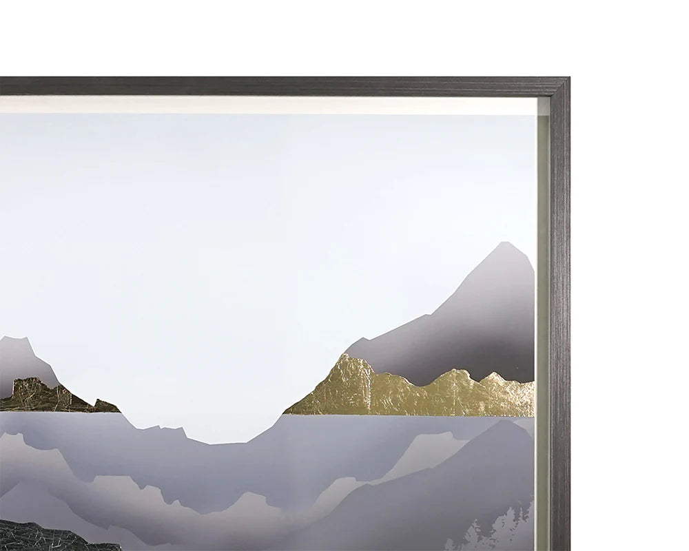 Incorporate the beauty of the great outdoors with this minimalistic artwork from our Luxe Art collection. This piece is a giclee print on archival paper and features hand embellished gold and silver leaf accents along with an elevated float mounting. Finished with a brushed solid pine wood frame in charcoal. Due to the reflective nature of gold and silver leaf, images on site may not capture the artisanal characteristics precisely. Hand-finished items will vary from piece to piece, resulting in a truly one-of-a-kind artwork.