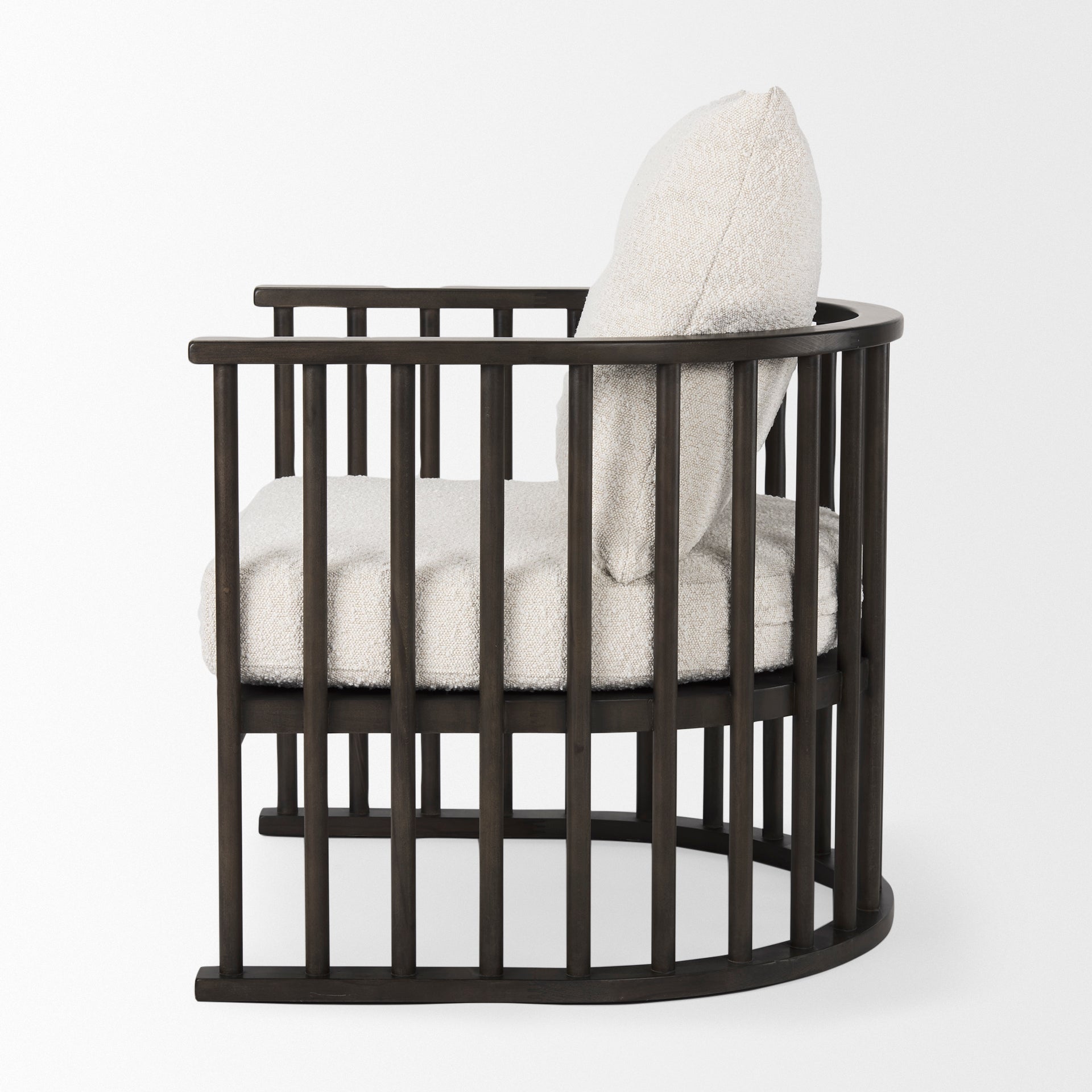 A contemporary accent chair that stylishly combines bouclé fabric with solid wood, barred and arched frame.