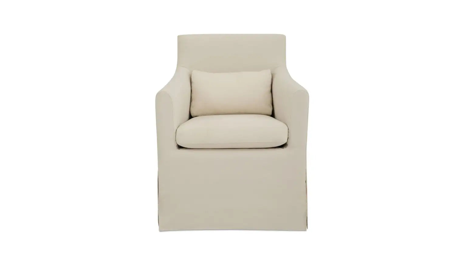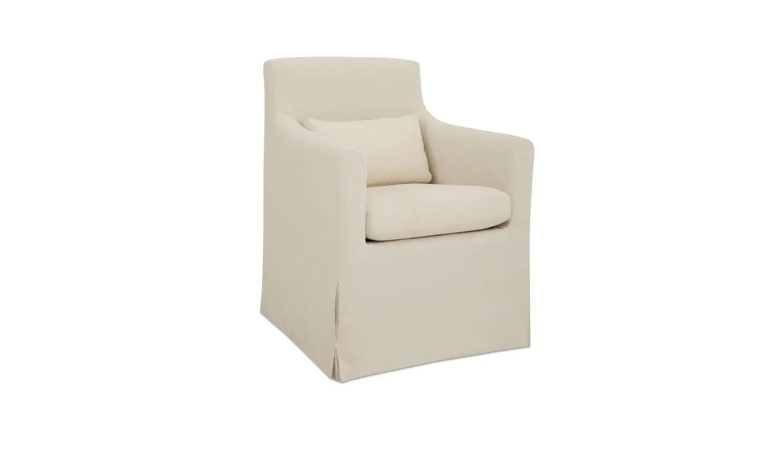 Make every outdoor meal feel considered. Lydia combines curved armrests with a light brown slipcover detailed by inverted pleats. Upholstered in recycled performance fabric, it’s supported by quick-dry cushions and an aluminum frame. A lumbar pillow adds comfort, while optional rollers allow for flexibility. A traditional profile built with smart outdoor materials, Lydia balances style and function in equal measure.
