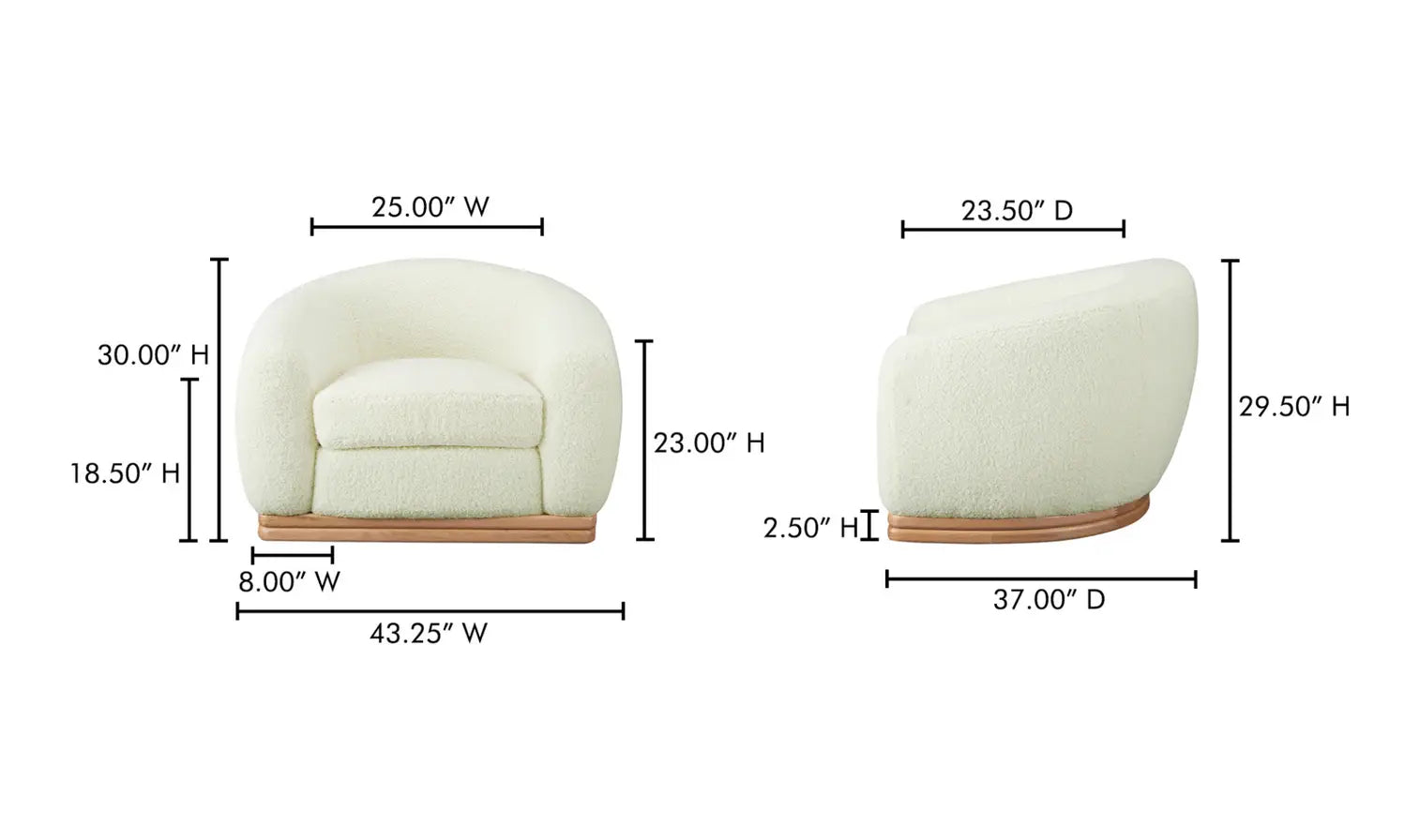 With its curved back and exaggerated proportions, the Marlowe lounge chair offers an enveloping sanctuary that is cozy and contemporary. The tiered rubber wood base adds visual interest as a contrast to the oversized seat. Soft faux shearling fabric adds a touch of elegance to a statement piece that brings both comfort and sophistication.