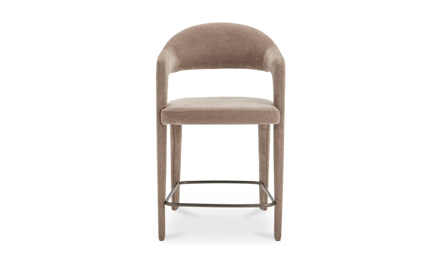The Martens counter stool features an open barrel back and a continuous curve from leg to frame. Its upholstery is complemented by generously padded seating, marrying comfort with a clean, uncluttered design. Armrests introduce a note of formality, while the airy back lends a touch of lightness and sophistication.