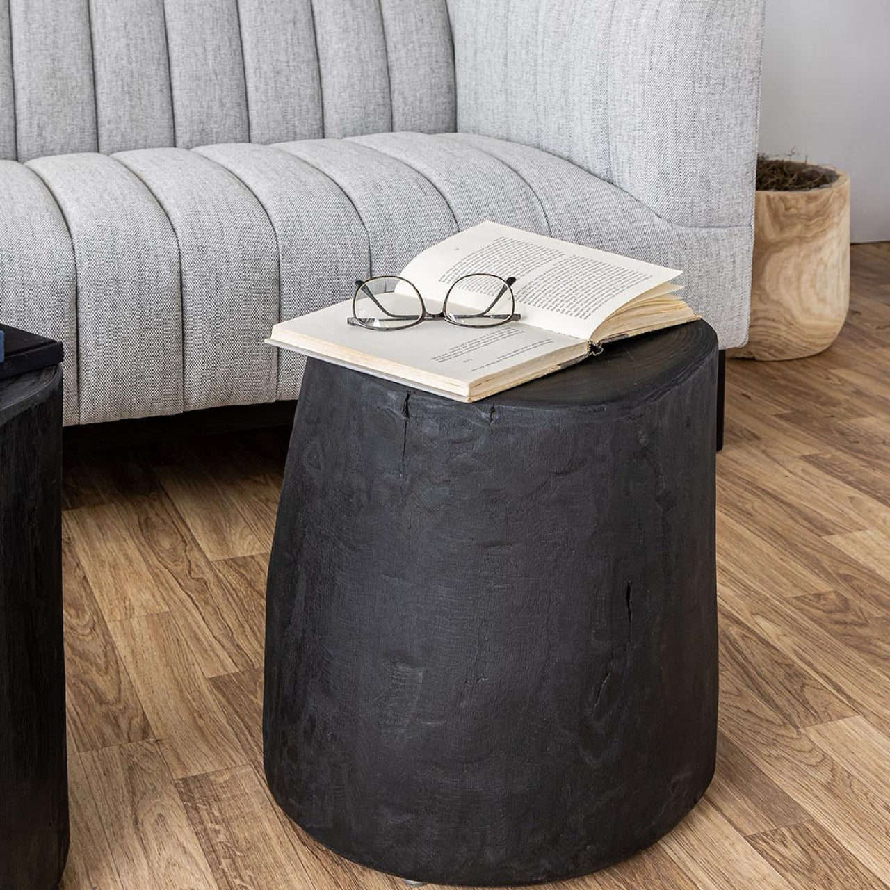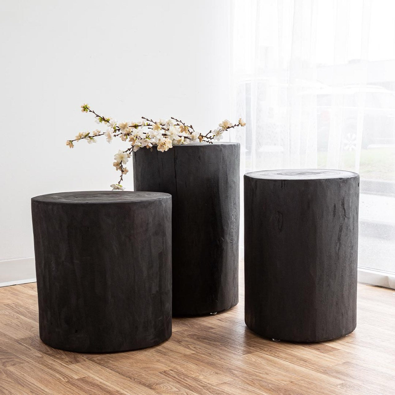 Handmade from sustainable solid paulownia wood, and stained in a rich, dramatic black matte satin stain, these stumps coordinate with any decor. Place them next to a sofa, beside an accent chair or in a bedroom as side tables or accent stools.