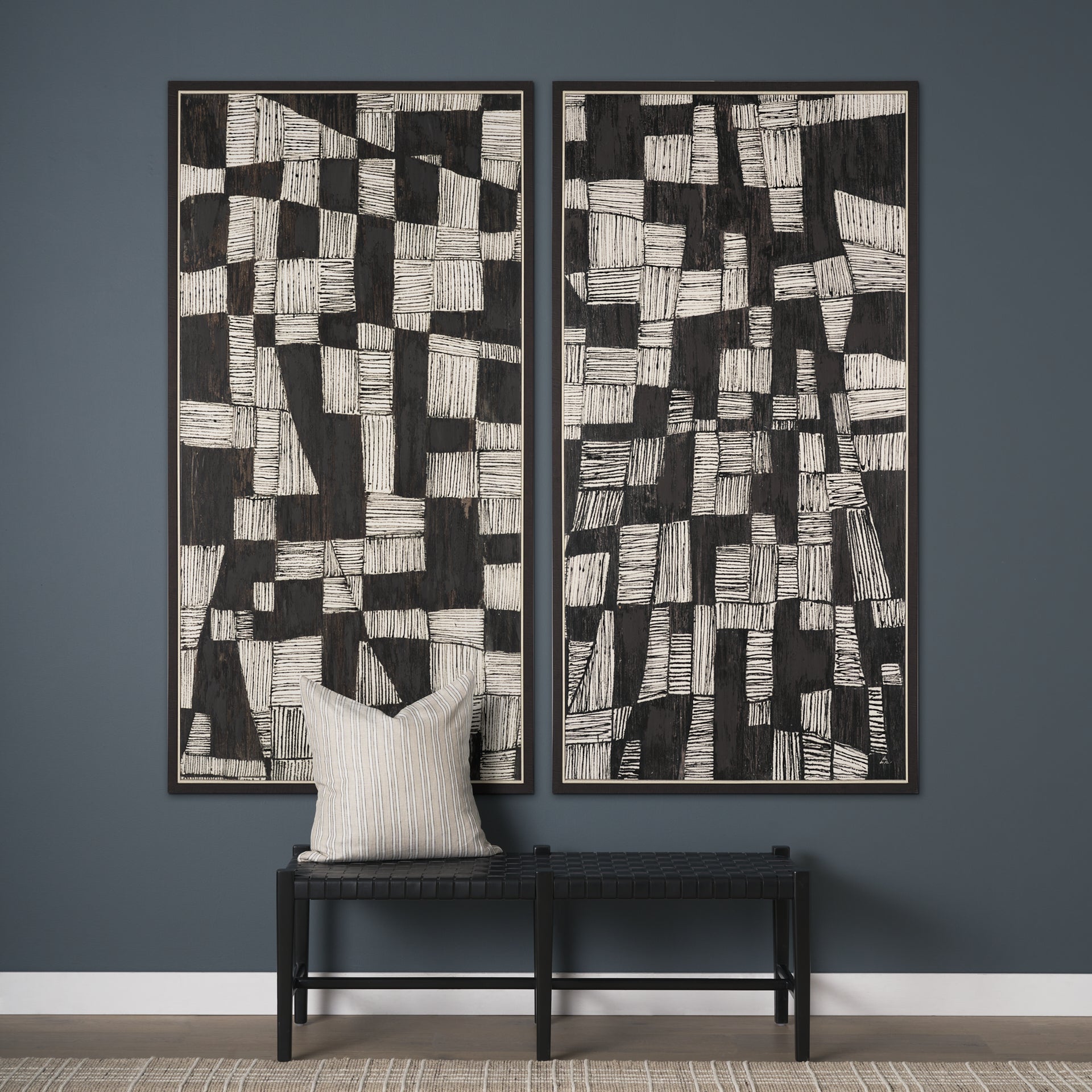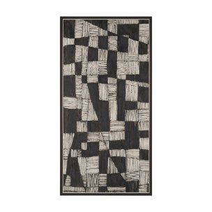 Features a monochromatic palette with contrasting black and white hues, creating a bold, geometric pattern with a contemporary feel.
