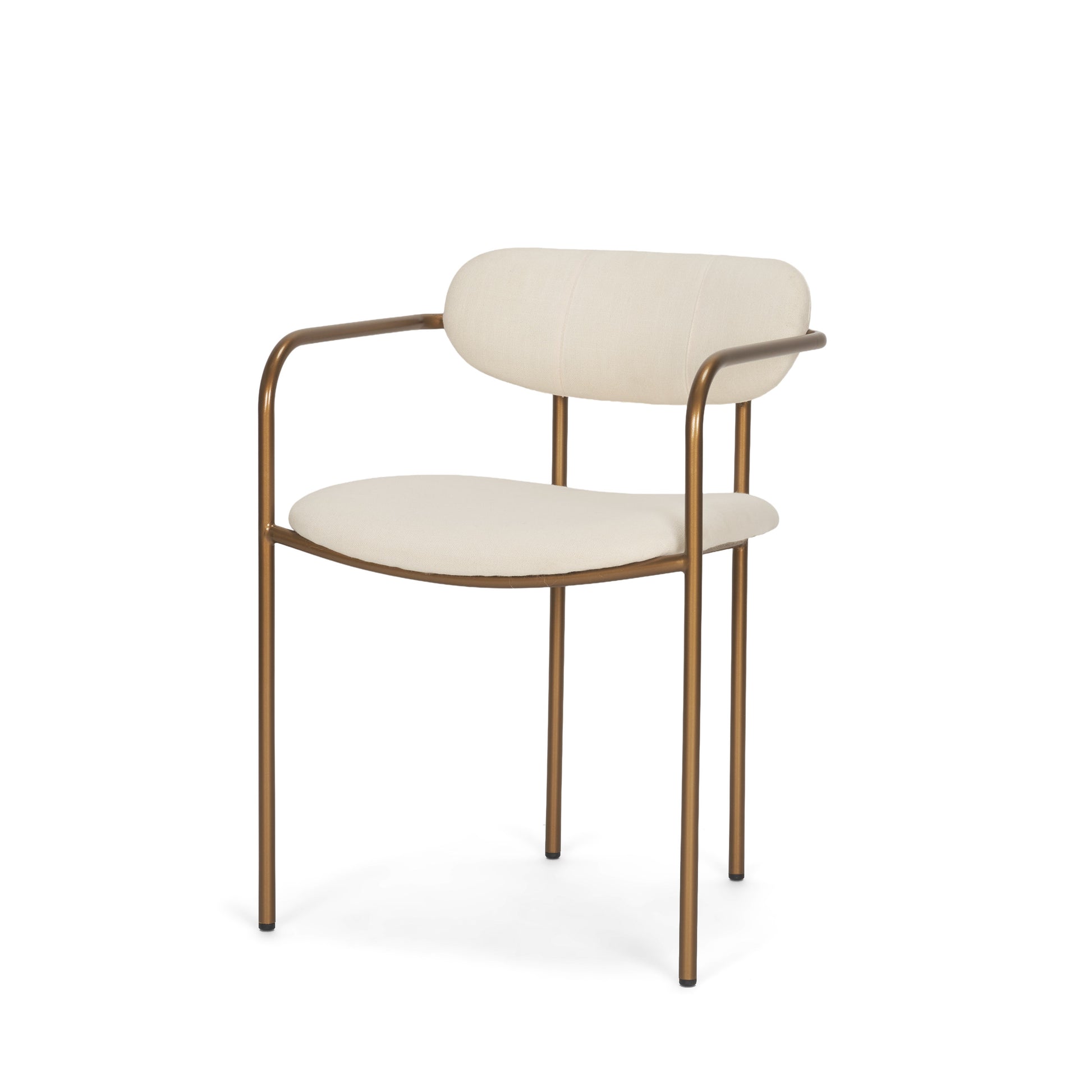 The Parker Dining Chair brings together refined comfort and minimalist sophistication with its tubular gold iron frame and soft, sculpted silhouette. A curved, floating backrest and gently rounded seat are upholstered in a creamy, durable fabric blend for subtle texture and elevated contrast. Its sleek profile and warm metallic finish make it a standout piece for modern dining spaces.