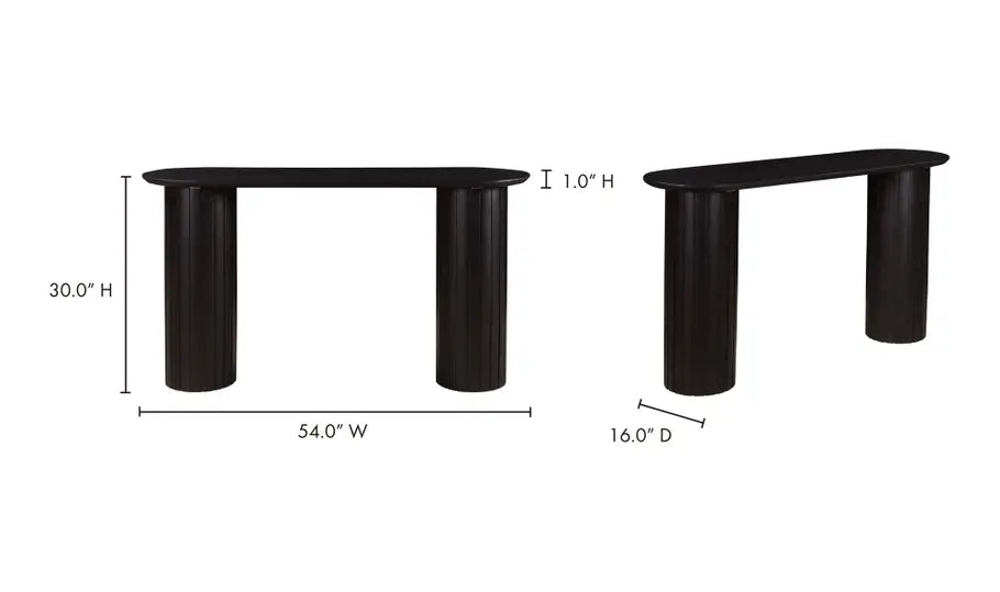 A convergence of shape and form, the Povera console table will serve as the pillar of your entryway or living area. Povera features two large columns supporting an expansive tabletop, their gentle ribbing reminiscent of ripples and waves. With a rich black finish featuring a soft purple undertone that allows the natural wood grain of the Acacia wood to show through, this console table uses simple geometry and natural materials to form an enchanting experience. Offering bold statement appeal, Povera incorporates the elegance of ratio into your home.