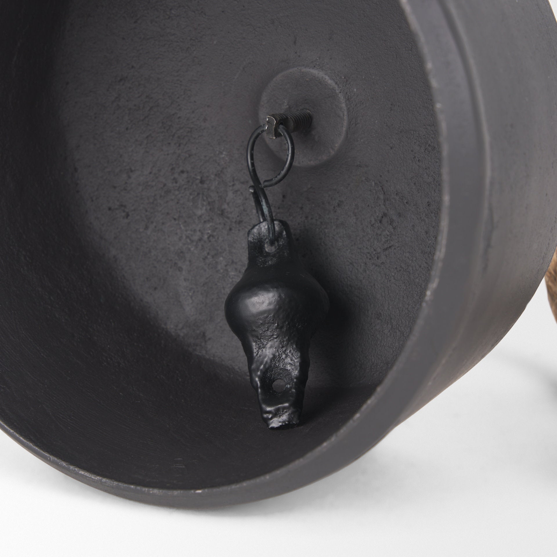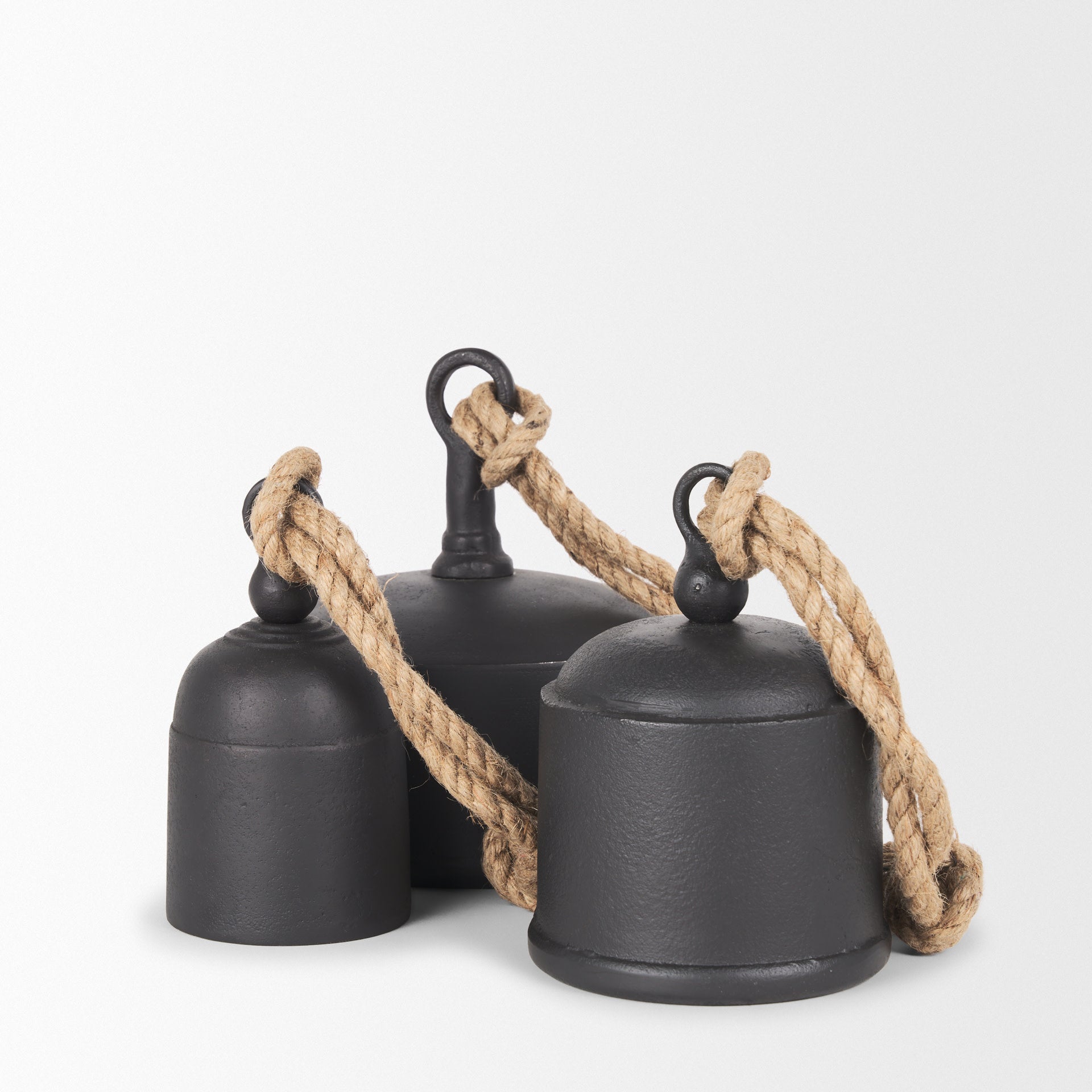 Quincy is a decorative matte black metal bell made from cast aluminum, finished with a rope handle.