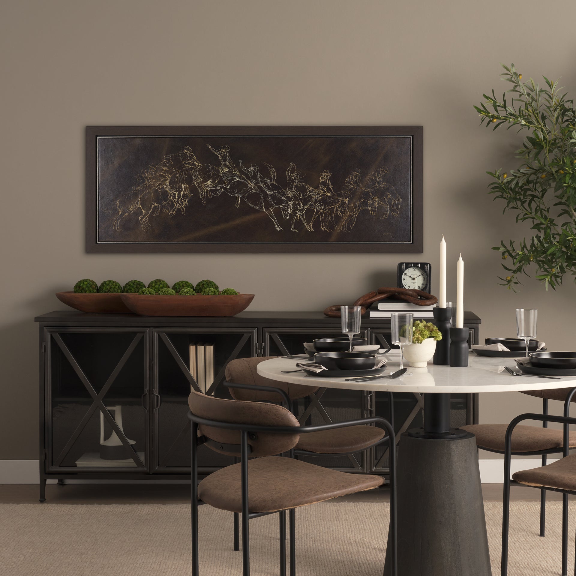 "Ride 'Em Cowboy" is a striking hand-rendered composition that captures the sequential motion of a cowboy and horse mid-jump with bold, cinematic rhythm. Delicate gold linework traces each phase of the leap in fluid precision, celebrating both equestrian grace and raw kinetic energy. Hand-embellished and float-framed, this piece fuses Western heritage with a modern, refined sensibility.