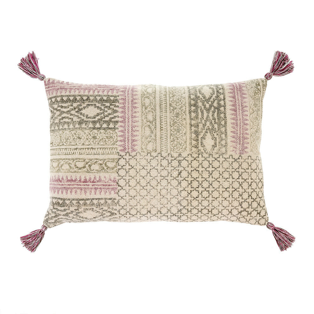 Global block printed pattern and corner tassels evoke worldliness and wonder in this warm-hued pillow. Complete with a premium feather down filler for fabulous fluff factor and comfort you'll want to sink your head into. Backside is plain cotton with a concealed zipper.