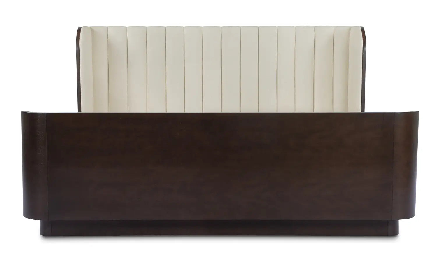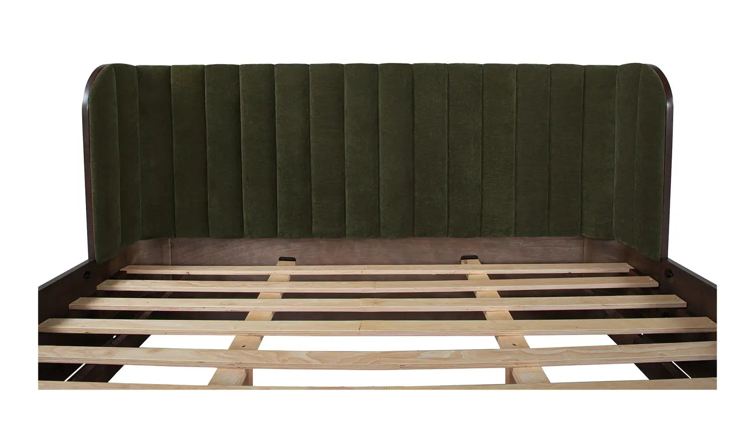 The Scarlette bed's classic sleigh design features soft polyester upholstery and a dark birch veneer over MDF frame that transforms any bedroom into a cozy retreat. Its foam and fiber headboard curves forward in a cocoon-like shape, offering a warm, enveloping embrace perfect for reading and relaxation.