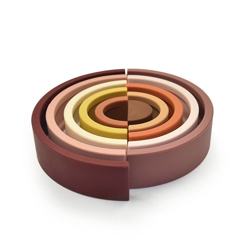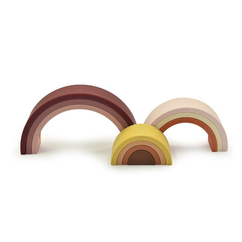 A minimal and timeless design, this rainbow silicone stacker is suitable for babies and children of all ages. It can be used as a teether, stacker, bath toy, open ended play toy, and more. 10 pieces in total.