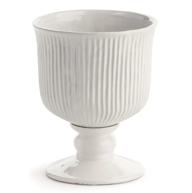 The traditional shape and ribbed design are traditional in feel. Drop in your favorite floral, and you've got a beautiful centerpiece. 7 x 7 x 8.5. Use as cachepot or plant directly into. Protect fine furniture by lining interior of pot. Protect from frost and hard freeze.