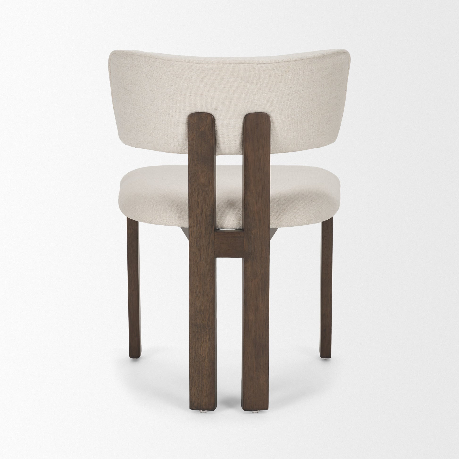 The Soho Dining Chair blends sculptural form with modern edge, featuring a bold double-beamed open back and a distinctive tripod-style frame. Crafted from kiln-dried rubberwood with a rich, dark brown finish and upholstered in creamy OEKO-TEX® certified chenille fabric, it brings artful presence and refined comfort to any dining space.