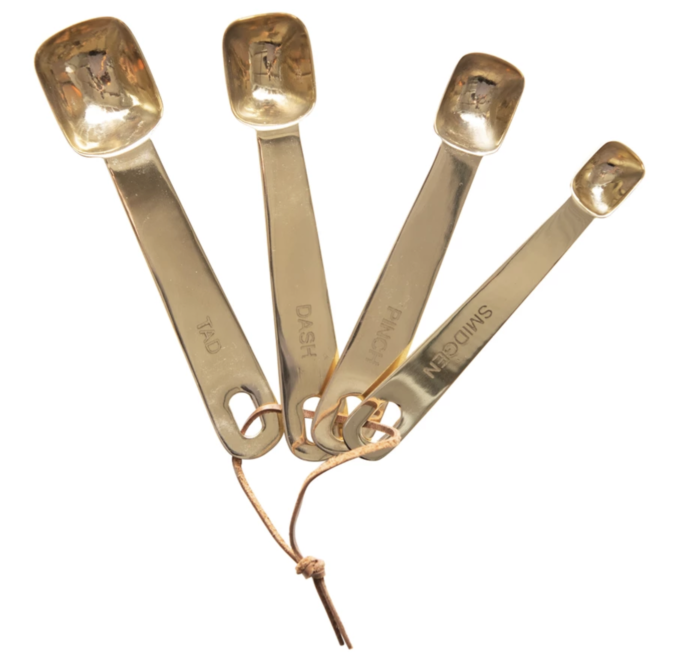 6"L Stainless Steel Square Measuring Spoons with Leather Tie, Brass Finish, Set of 4