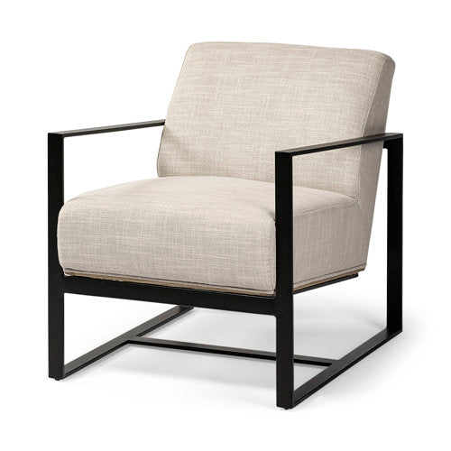 The Stamford I is a stylish, fabric-wrapped accent chair braced by a sturdy, matte-black toned metal frame.