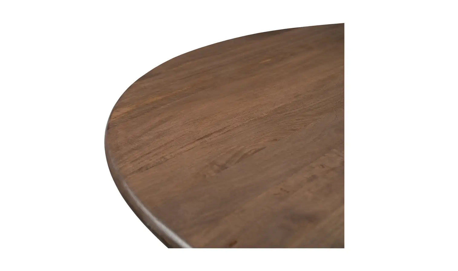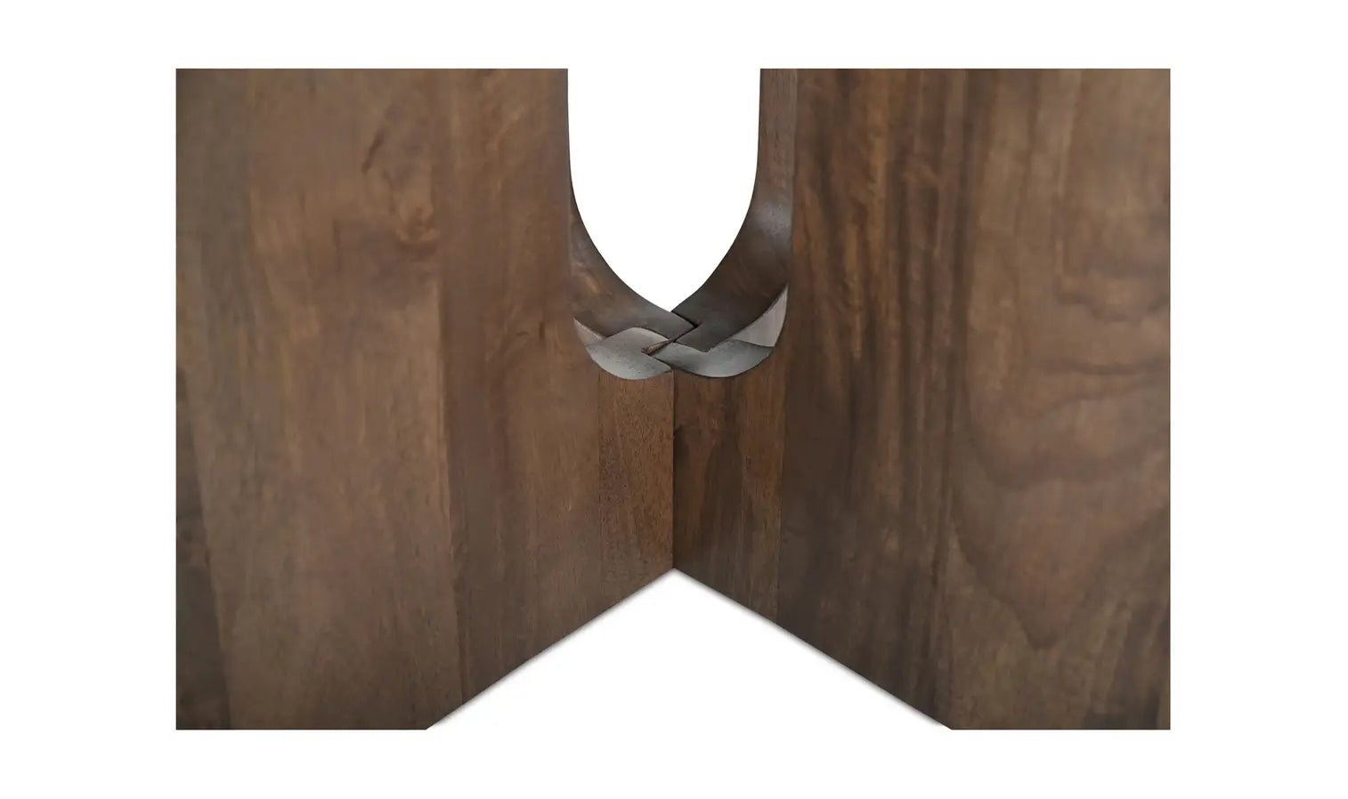 The Stanley dining table features a unique cross base with artfully carved arches at each end that lend an airy feel to its robust construction. It offers a durable, smooth surface ideal for daily dining and entertaining. The mango wood construction grounds the piece, making it a versatile fit for diverse interior styles.