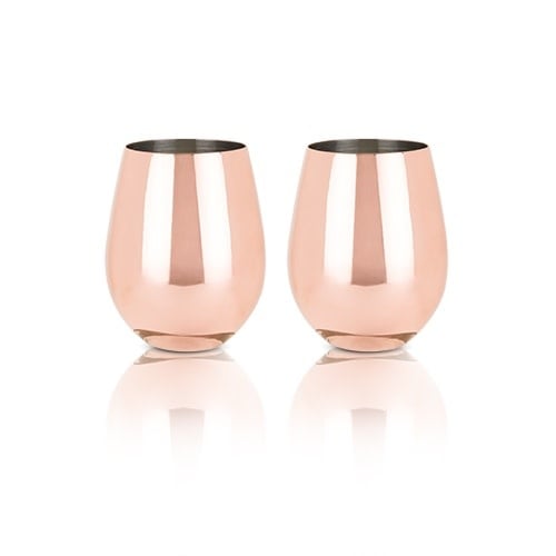 Savor Sauvignon Blanc and Chardonnay from an eye-catching pair of stemless copper tumblers. Each polished and perfectly rounded to fit the curve of your palm, these mirror-finished metal glasses collect and intensify the aromas of your drink for an appetizing taste every time.