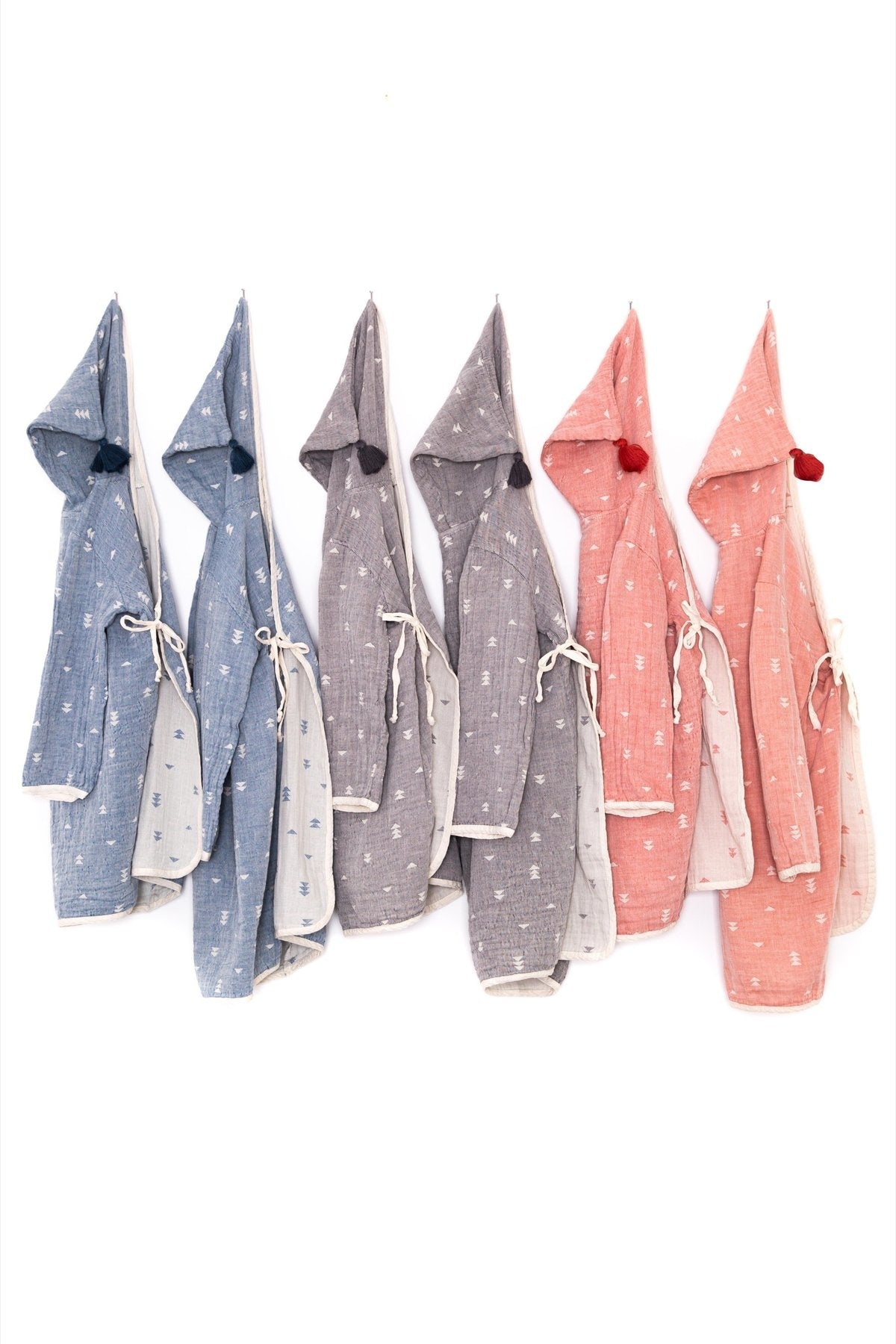 Our Pebble Kids Bathrobe is made from our signature Turkish muslin cotton. Featuring a loose fit that is non-restrictive and highly durable with a simple tie closure. The Turkish Cotton offers a highly absorbent and fast drying option and a cute hood for wet hair or chilly days.