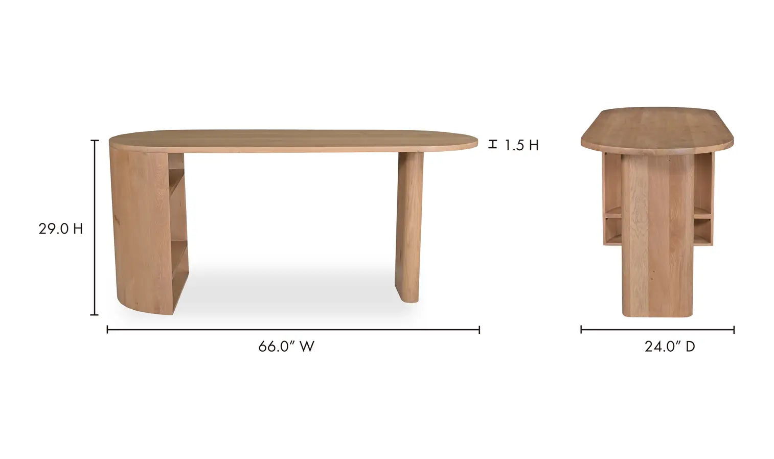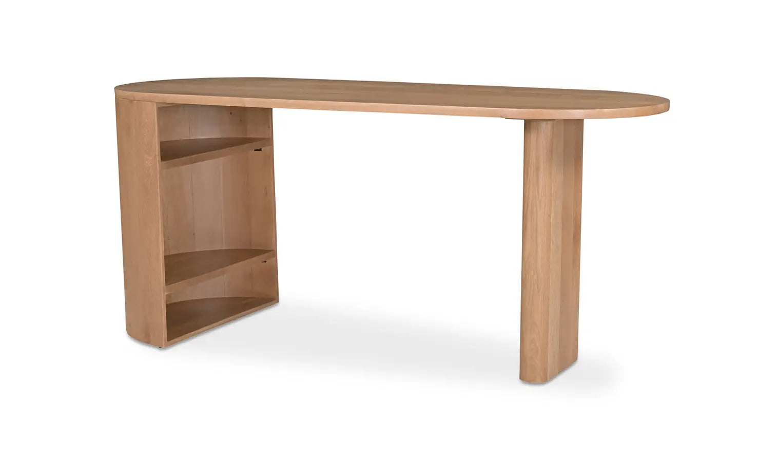 A desk that actually gets your workflow. The Theo desk pairs a curved profile with open shelving and plenty of room to spread out. Made from solid oak with a semi-gloss finish, it celebrates the beauty of natural wood—knots, grains, and all. With three integrated shelves and a fully finished back, it’s made to look good from every angle—and work just as hard as you do.