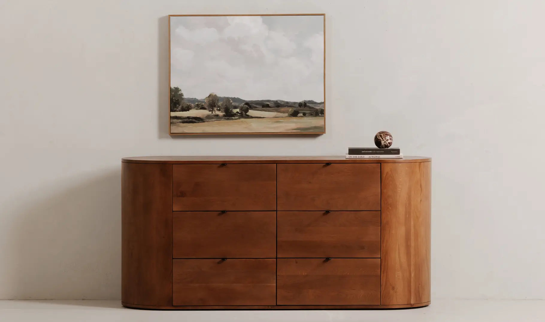 Full of natural appeal in solid oak, the Theo 6 drawer dresser features a curved, minimalist design. Beautifully simple and functional, this dresser features 6 drawers with soft-close glides and drawer safety stop.