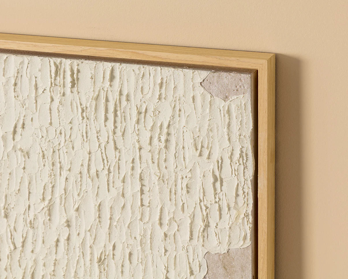- Completed with a floating solid pine wood frame in a natural finish.